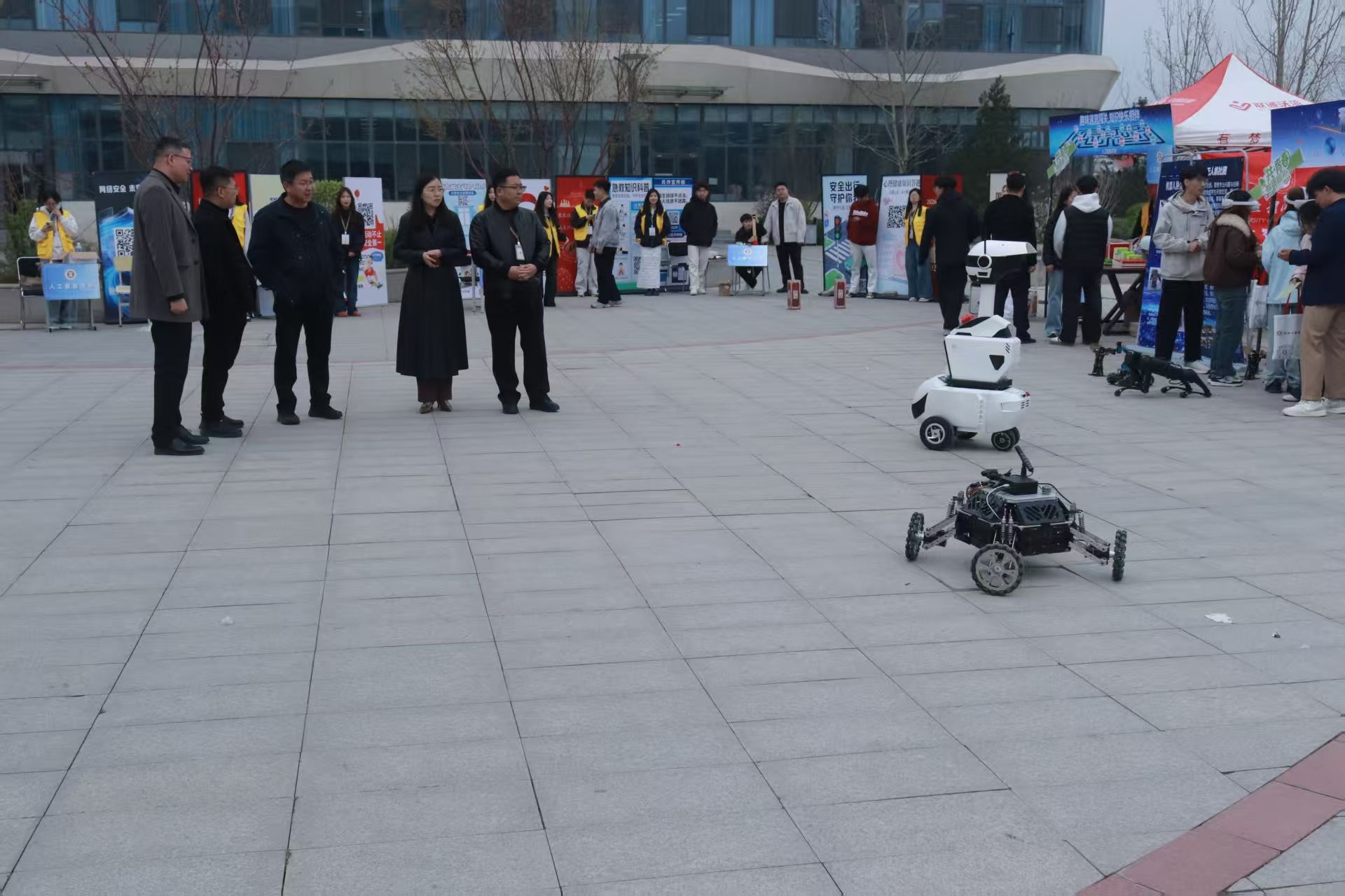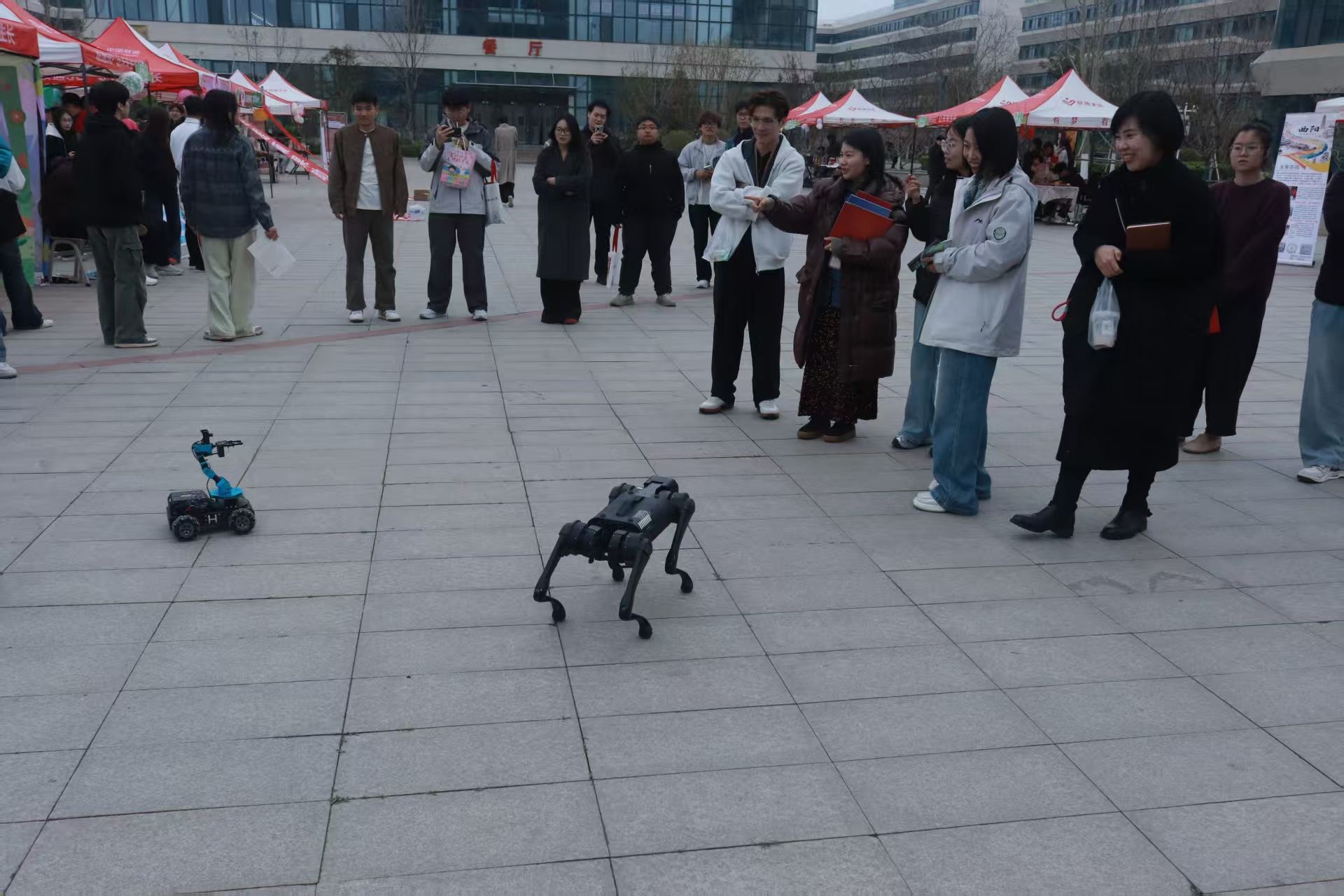 春日市集现场热闹非凡,学院精心布置展区,以科技为名片,集中展示学院社团的专业风采与创新实力。机器狗展区吸引了大批学生驻足——它随节奏灵活起舞、俯身互动,动作流畅生动,引发阵阵惊叹;学生们踊跃参与互动,亲身体验操控过程,领略人工智能技术的神奇与乐趣。VR体验区同样备受欢迎,学生们戴上VR眼镜、手持控制手柄,沉浸于虚拟世界之中,新奇的沉浸式体验令人流连忘返。无人机展示区则以其精巧的结构设计和扎实的技术背景,吸引学生们前来了解探寻。学院展区以鲜明的科技特色成为市集中一道亮丽的风景线,充分彰显了学院学生将专业知识转化为生动实践的能力与热情。