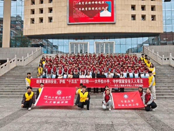 人工智能学院于2026年4月16日在8号教学楼前开展“大手拉小手”国家安全教育活动。人工智能学院党总支书记、学管副院长尹钧,团总支书记王凤,石家庄市红旗大街小学教育处副主任陈晓楠及五年级全体师生出席活动,人工智能学院学生志愿者团队全程参与,红旗大街小学全体五年级学生受邀走进大学校园,沉浸式学习国家安全知识、感受高校育人氛围。