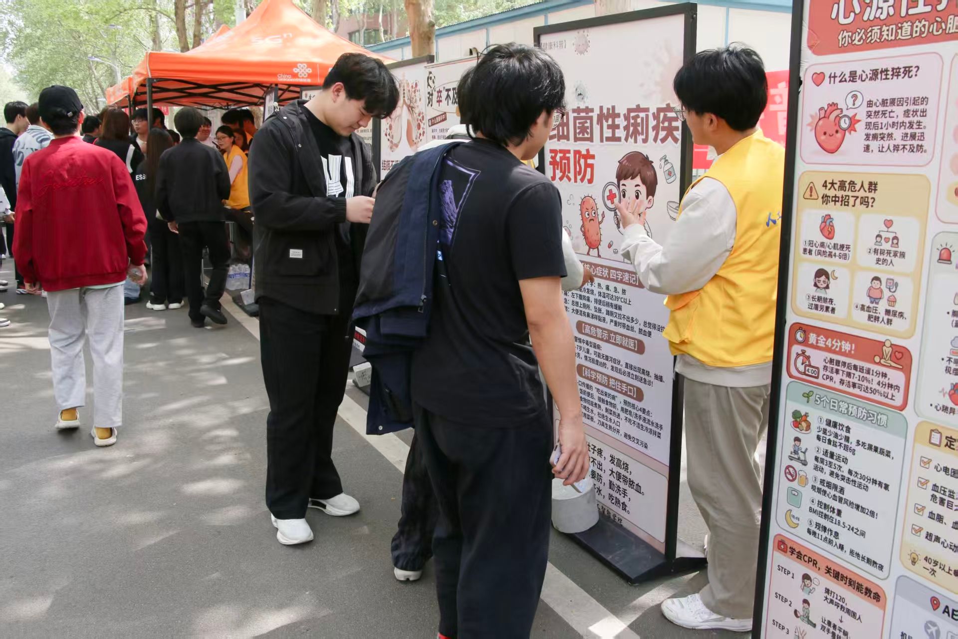 活动伊始,工作人员借助精心布置的展板,通过图文并茂的方式,系统阐述了肺结核、抑郁症、细菌性疟疾等多种身心疾病知识,并以疾病定义为切入点,依次讲解了各类疾病的早期感染症状与传播途径,特别针对传播途径方面的认知误区进行了详细说明,有效纠正了学生的错误观念。随后,深入介绍了常见感染疾病后的临床表现,如结核病导致的持续发热、高烧不退或伴随恶心、食欲不振等不良反应;传播途径及其常见误区,如诺如病毒可通过污染水源、病人使用物品及被病毒污染的食物和空气传播,而结核病则不会通过握手传染等;具体预防措施,如佩戴口罩、勤洗手等;以及心源性猝死的急救方法,包括心肺复苏的胸部按压操作流程和注意事项。最后,工作人员组织了问答互动环节,内容聚焦于感染初期的典型症状、正确急救措施、传播途径等基础知识及易错点。学生跟随工作人员依次参观三大展区,认真聆听讲解,积极参与答题,有效纠正了认知误区,解决了心中疑惑,逐步建立起科学的疾病预防观念。