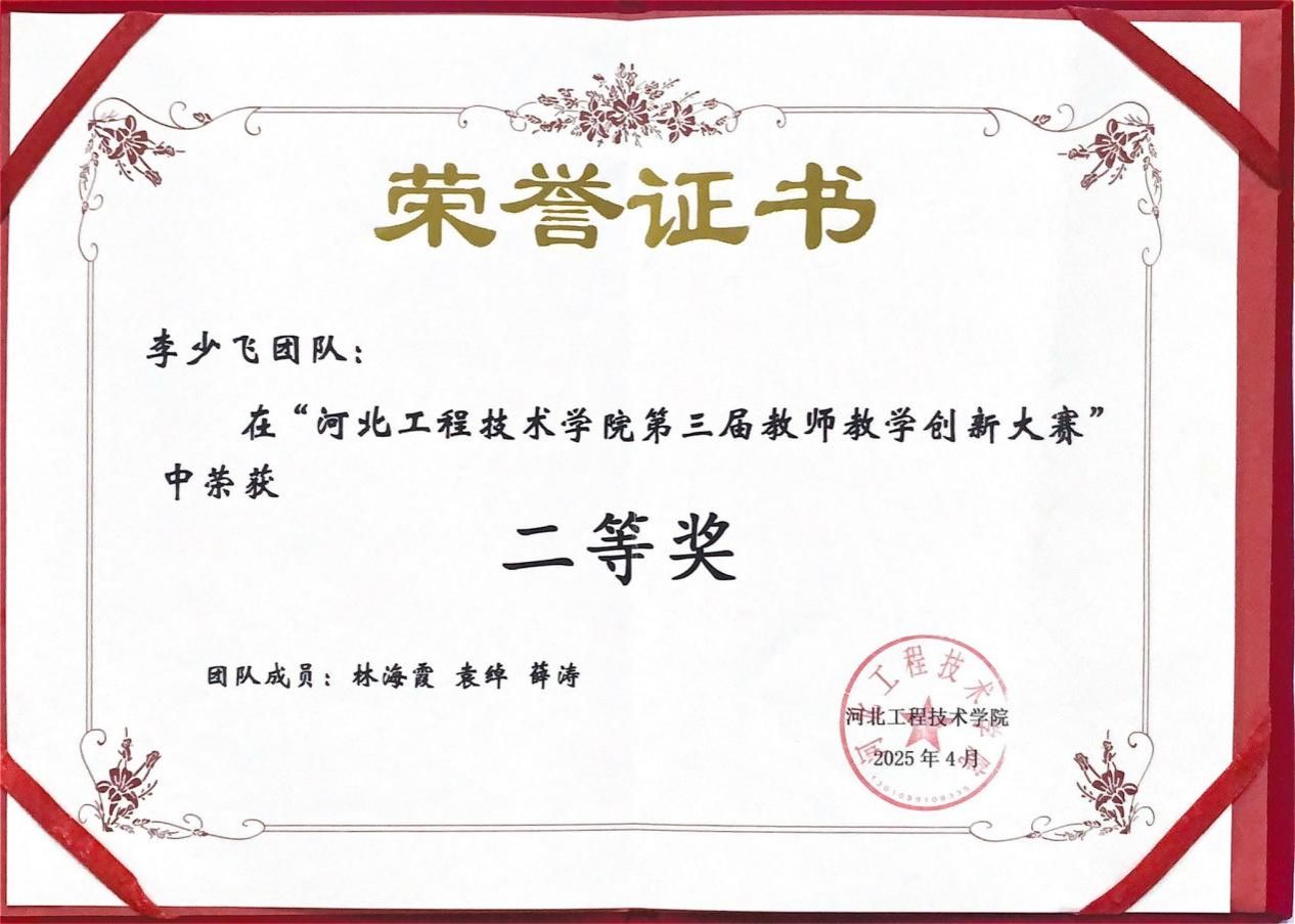5.河北工程技术学院第三届教师教学创先大赛,李少飞团队获二等奖。
